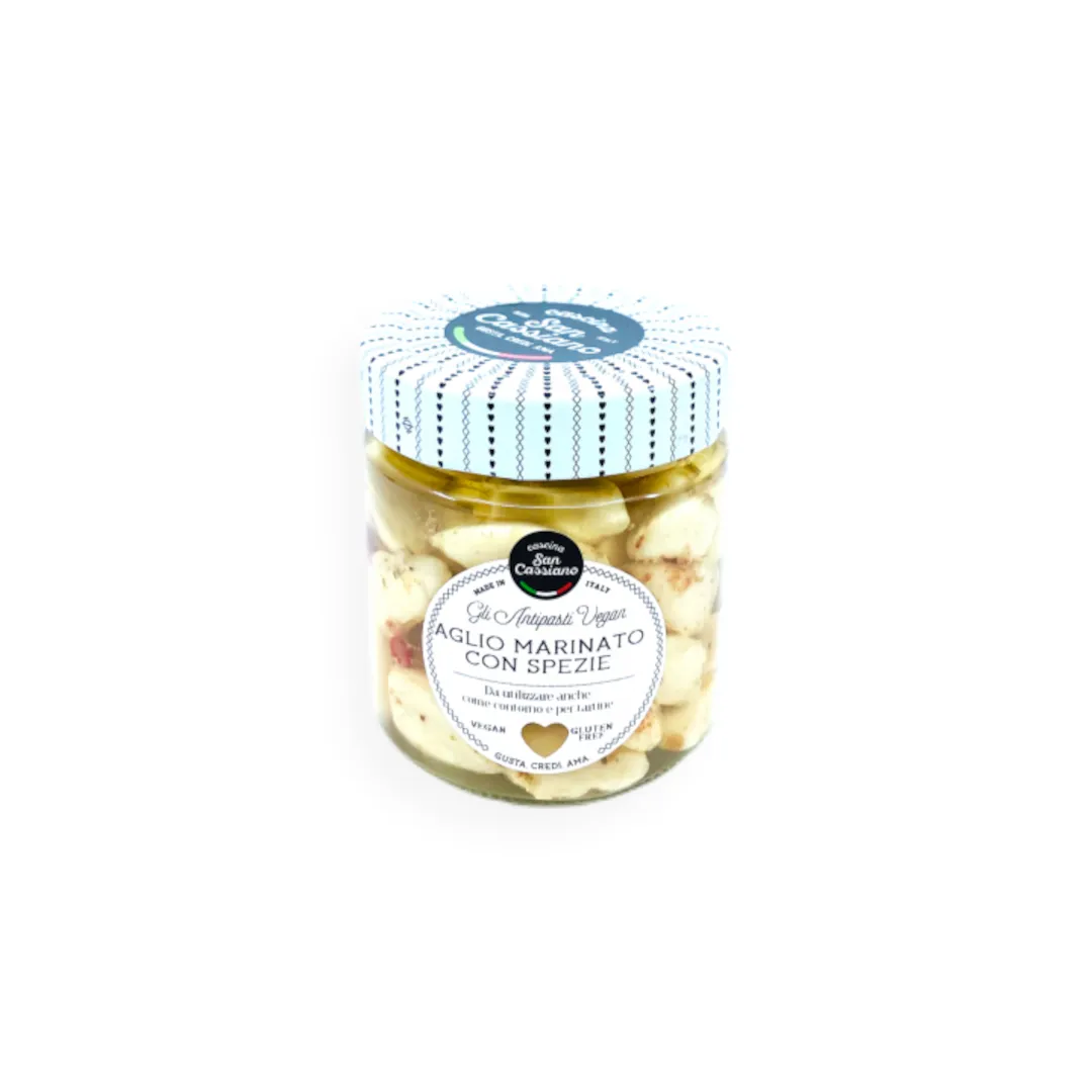 Aglio fresco marinato in olio d’oliva, finemente condito con spezie. La conservazione in olio lo rende morbido e particolarmente gustoso, ottimo per impreziosire aperitivi e stuzzichini.