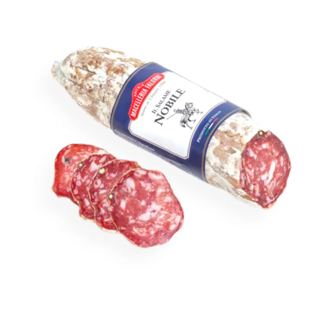 Salame a macinatura grossa, viene prodotto con metodi artigianali, insaccato in budello naturale e stagionato naturalmente per 3-4 settimane. Il Salame Nobile di Antica Macelleria Falorni è senza lattosio e senza glutine.