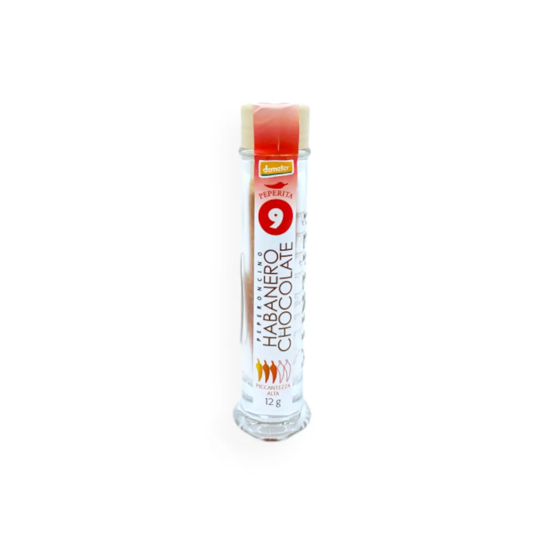 Polvere di peperoncino ottenuta esclusivamente dalla varietà Habanero Chocolate della specie Capsicum chinense coltivata in regime biologico/biodinamico ed essiccato a freddo.