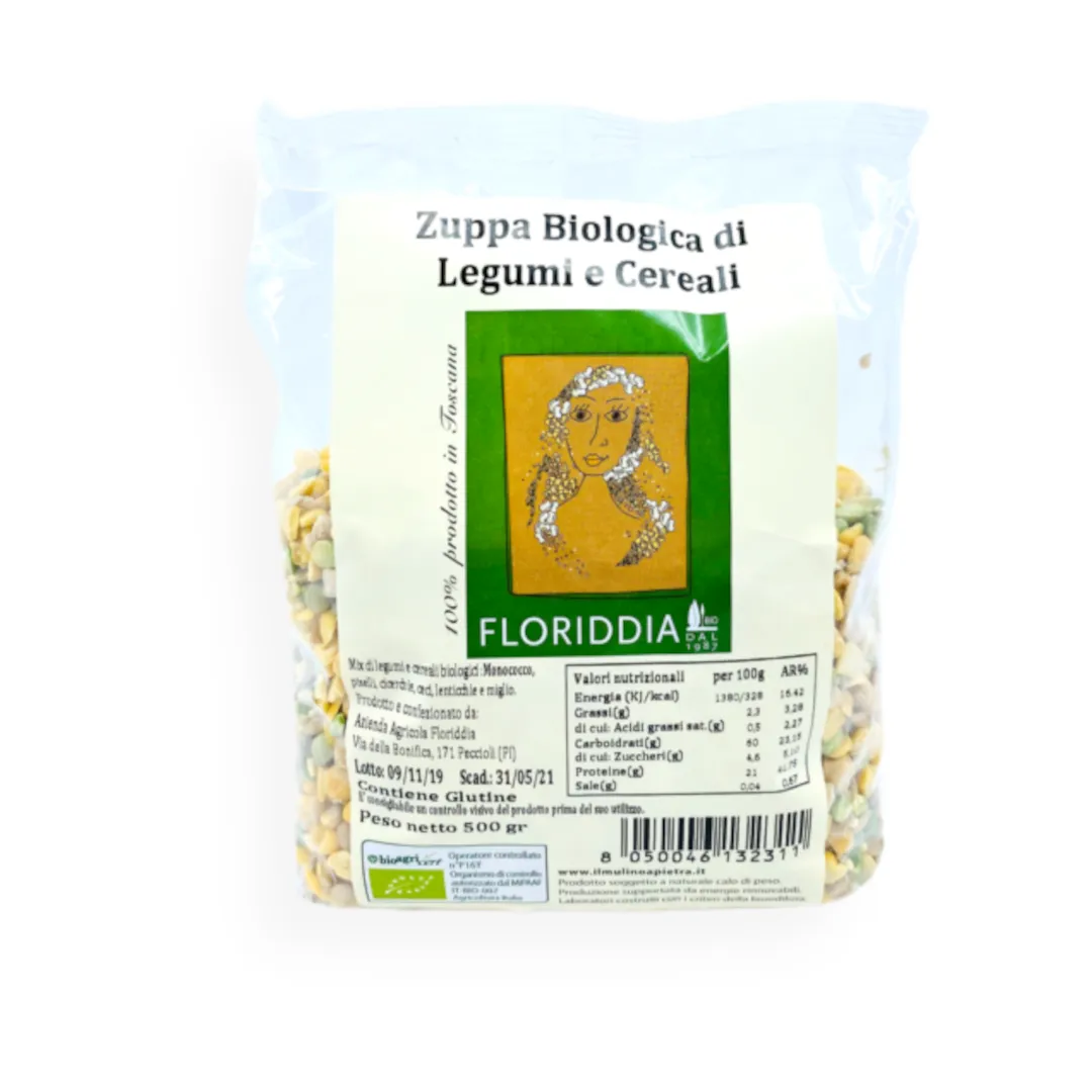Mix di legumi e cereali biologici: Monococco, piselli, cicerchie, ceci, lenticchie e miglio.